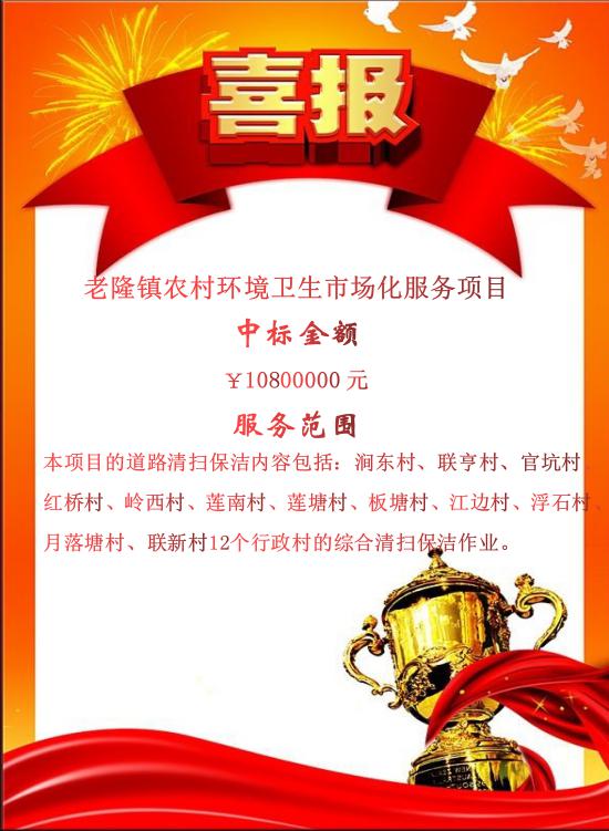 熱烈祝賀深圳市龍吉順實業(yè)發(fā)展有限公司成功中標(biāo)老隆鎮(zhèn)農(nóng)村環(huán)境衛(wèi)生市場化服務(wù)項目。龍吉順公司憑借突出的業(yè)績、雄厚的技術(shù)實力以及良好的市場信譽,在眾多競爭對手中脫穎而出,順利中標(biāo)。這無疑是對公司的綜合實力、技術(shù)水平和公司團隊凝聚力的又一次肯定。
